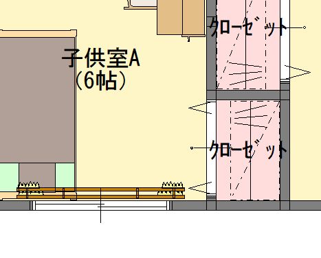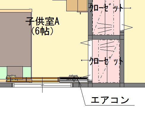 このように子供室の窓際に設置されたクローゼットがあります。ここで注意して欲しいのはカーテンレールとエアコンが折戸の開閉に干渉しないか?という事です。