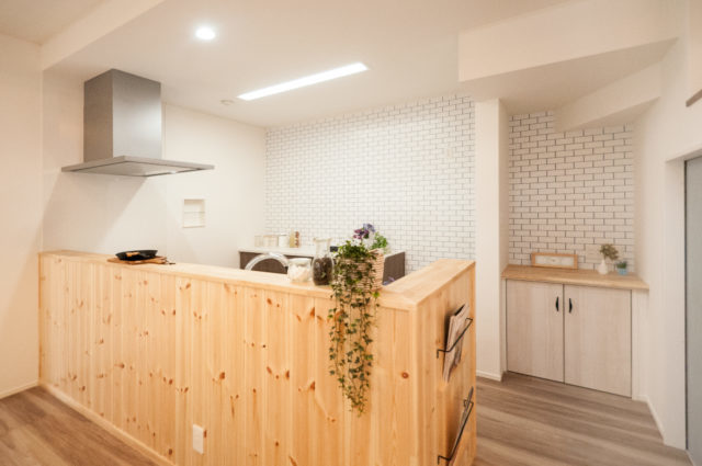 パイン材の腰壁が素敵な対面キッチン(施工事例はコチラを参照下さい:シティハウス産業HP施工事例)
