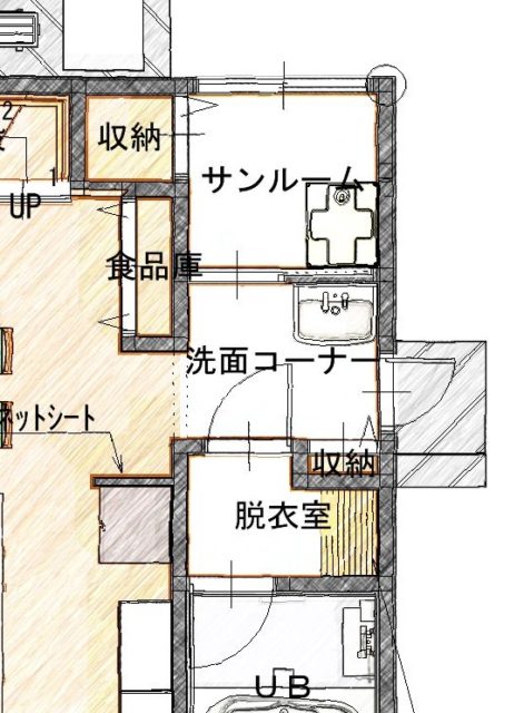 参考までに、以前お客様から洗面室と脱衣室を分けたいというご要望を頂いたので、このような間取りをご提案させていただきました。