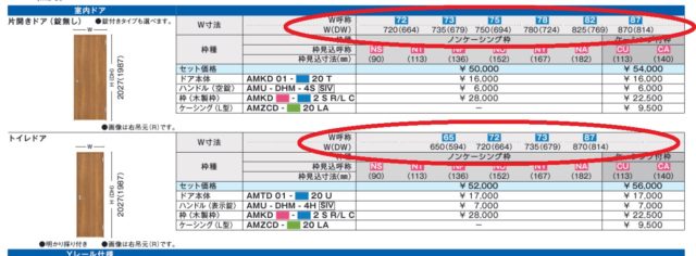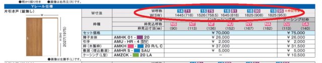 上のカタログに赤丸をしたところに表記されているのが既製品の寸法です。なぜ既製品の寸法が良いのかというと部屋の出入りに不便を感じる事が少ないと思われるからです。逆に言うとこの寸法に当てはまらない建具を採用する際、広い分には良いけど、狭い場合は注意が必要です。