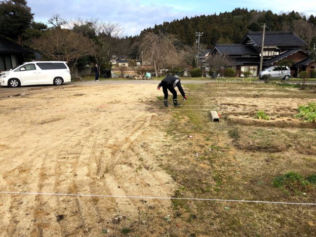 配置が決まるとまずは建物位置の確認という意味で白いロープで地縄(じなわ)を張ります。地鎮祭をする際にも建物の中心に祭壇を設置する事が多いので、そういう意味でも地鎮祭の前には張るようにしています。