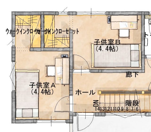 天井付近に設置する窓といえば開閉がしにくいので、開閉出来ないFIX窓が採用される事もありますが、換気を図りたい場合にはやは高所用滑り出し窓の設置をオススメしています。そこで今日は上の間取りでいう子供室Aの窓を設置する際に注意して欲しい事をご紹介します。