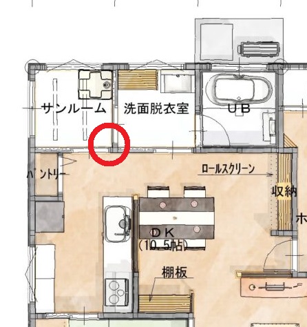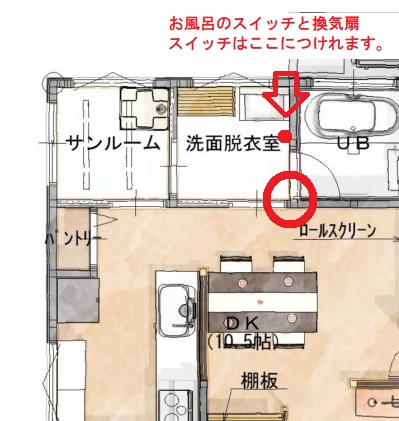 基本的にスイッチは入り切りしやすいように室内へ入った横の壁につけるのが一般的です。(お風呂は外側、トイレは内外両方の場合があります。)それを前提に上の間取りを見てみるとキッチンからサンルームへ入った引き戸のところにスイッチを付けれる壁がないのです。