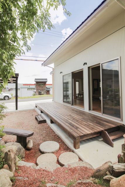 リビングのテラス窓から出入りできるウッドデッキ(引用元:シティハウス産業HP施工事例)