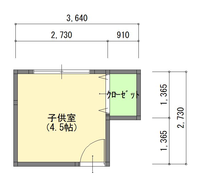 まずこのようなお部屋を想定します。当たり前ですが、出入り口のドアは廊下に開くと廊下を歩いている家族に当たってしまうかもしれないので、このように部屋側に開くように想定し、採光の関係もあるので、壁一面に比較的大きな窓を設置しています。