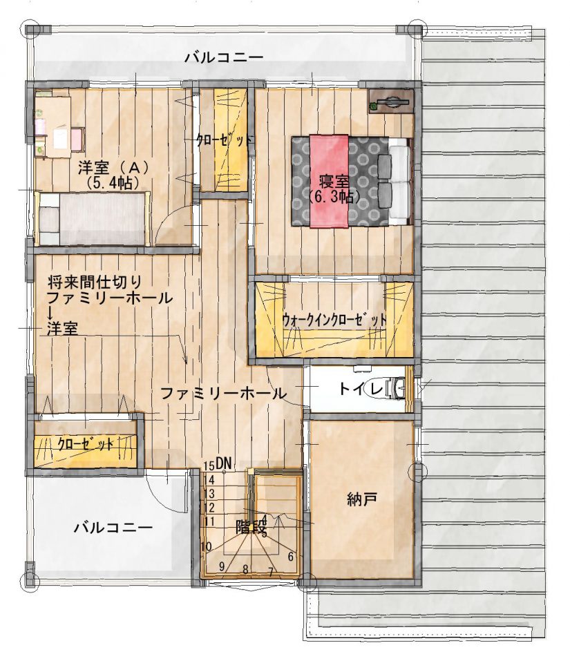 2Fは、ファミリーホールとして、広々としたスペースを作りました。このスペースは、将来的には壁を追加し、今は一つの子ども部屋を二つにすることができるよう配慮したつくりになっています。ファミリーホールからは奥行きのあるバルコニーに続いています。