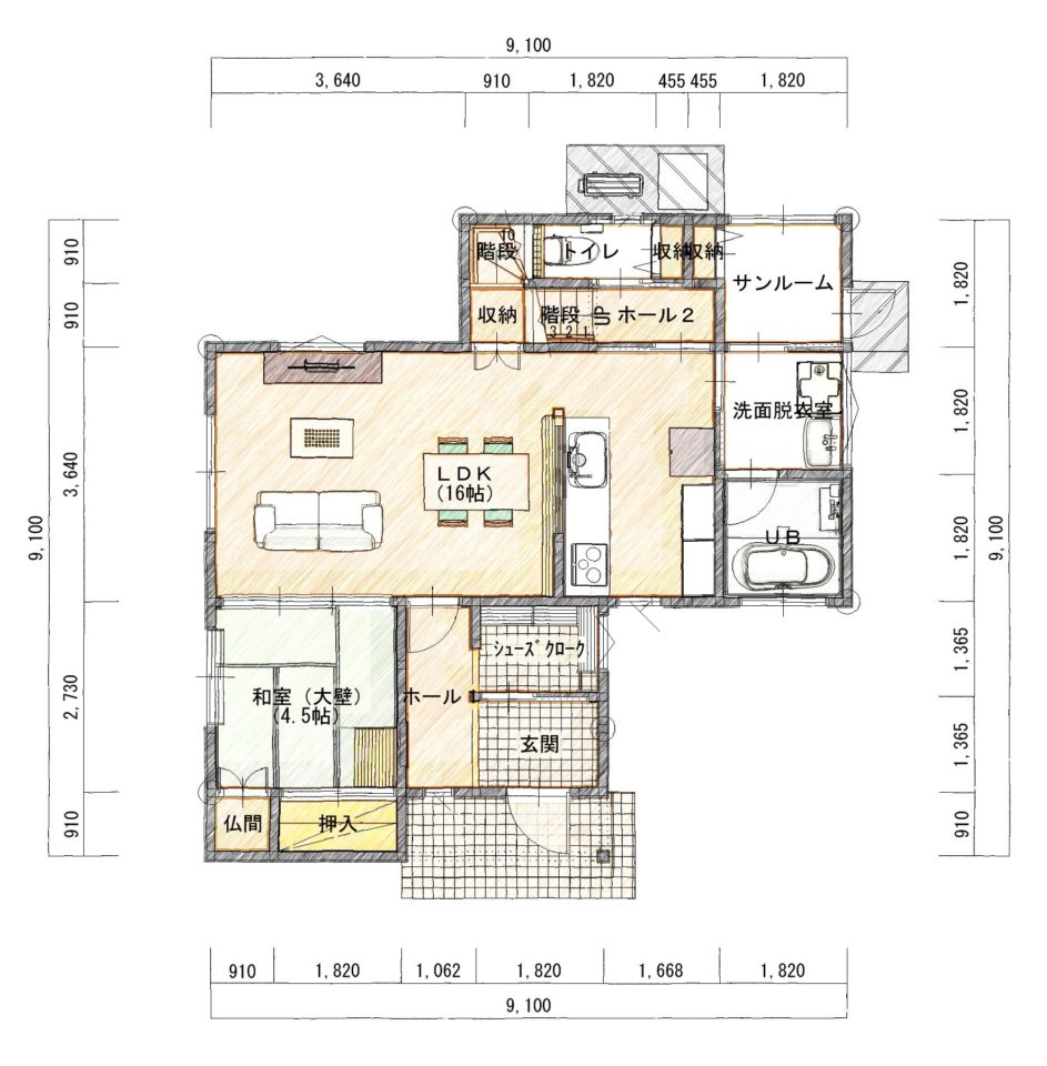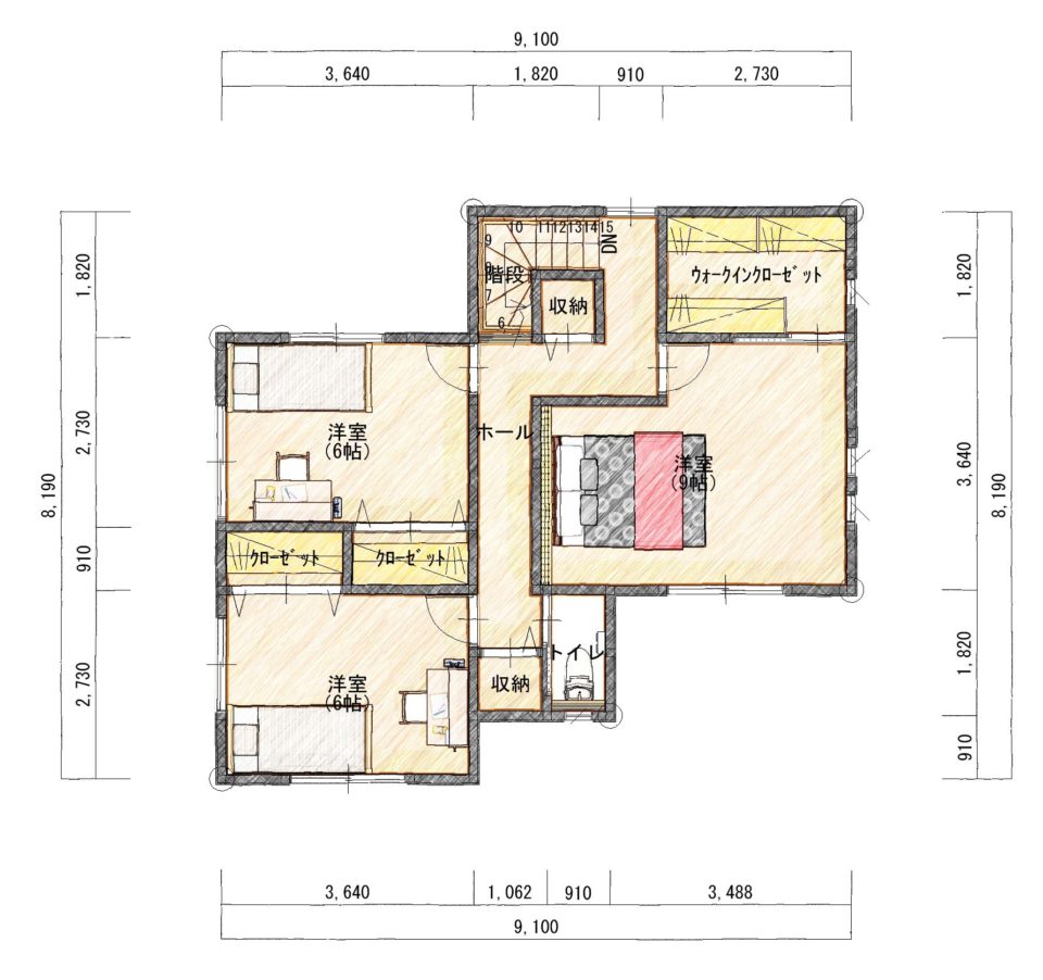 2階へ行く際には必ずリビングを通っていかないと行けなかったり、お風呂に入る時もキッチンの横を通らないと行けないような動線にした間取りです。