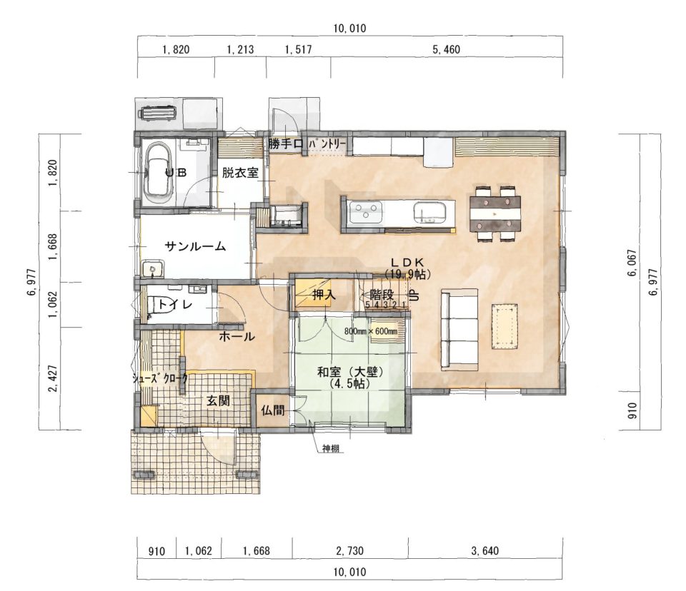 そのようなご要望を満たす間取りです。沢山の機能を備えていながらも35坪程度に抑えたので、ご予算的にも嬉しいプランです。