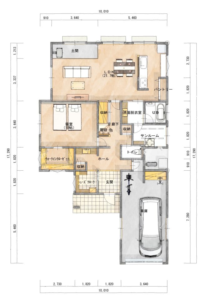 インナーガレージもとても便利だし、水廻り動線も豊かに暮らせるようにしっかり考えました、