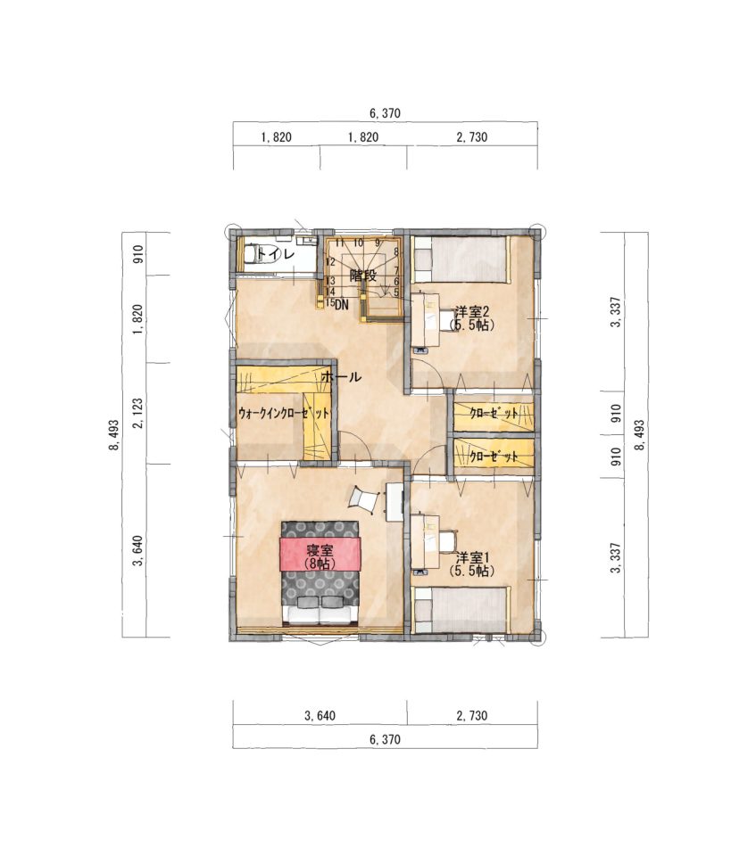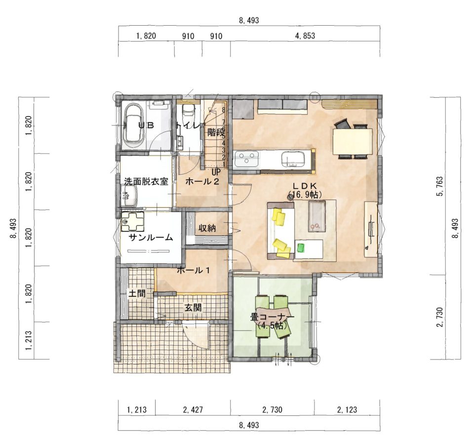 しかし、リビング階段だと冬場の暖気が逃げないか心配という方にはこのような位置にホールを設ける間取りをご提案しています。リビング収納を設けてリビングにものが溢れないような配慮もされており、とても暮らしやすい間取りです。
